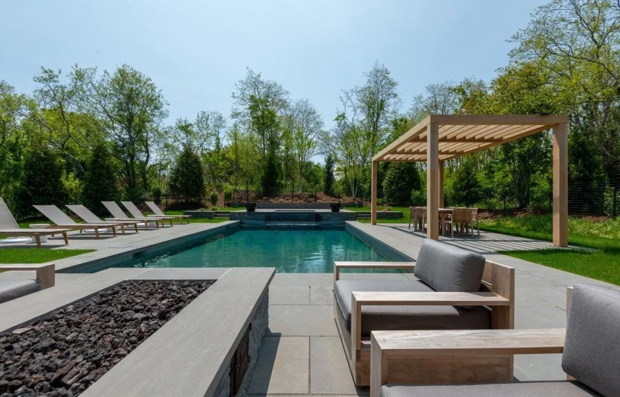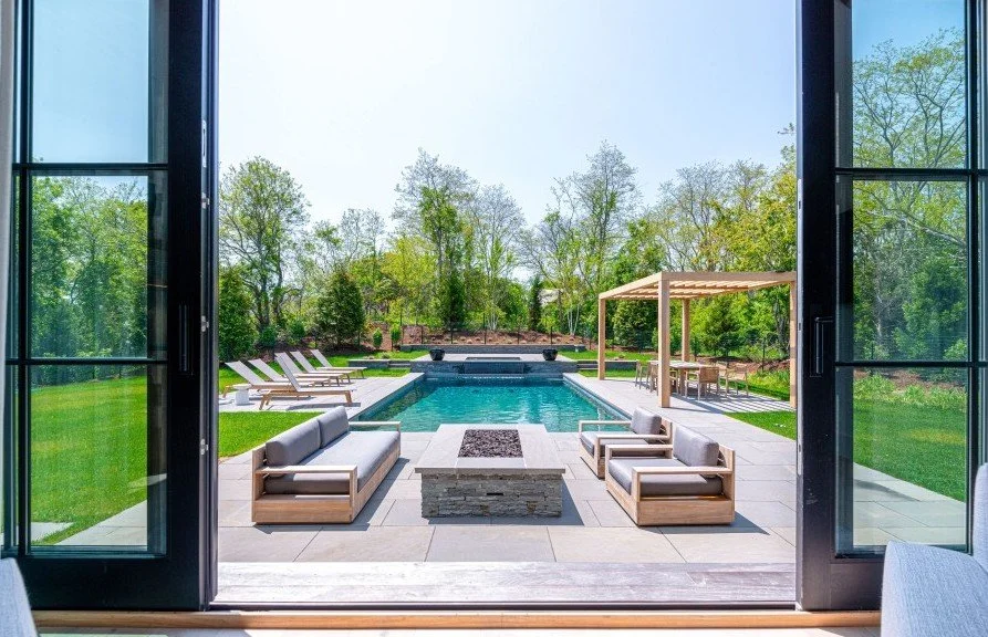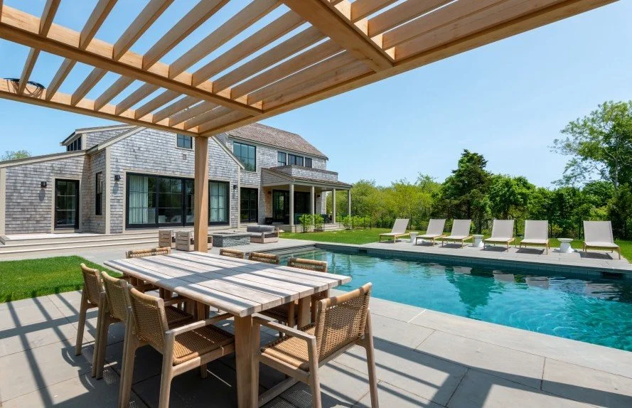 An open-air gym with large barn doors adds to the property’s unique character. The landscape design allows for effortless indoor-outdoor living, thanks to an oversized lawn and bluestone patio with 18’ x 36’ pool w/ 9x9 baja shelf, pool pavilion, outdoor fireplace, and multiple outdoor seating and dining areas.